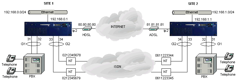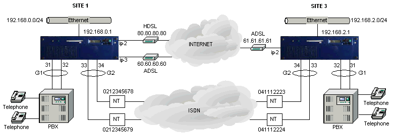 Consider an Abilis placed in “Site 1”that is connected to another Abilis placed in “Site 2” with a VPN (with backup ISDN) which transports data and compressed phone calls.