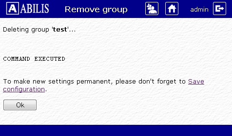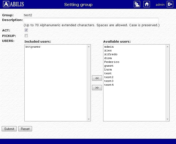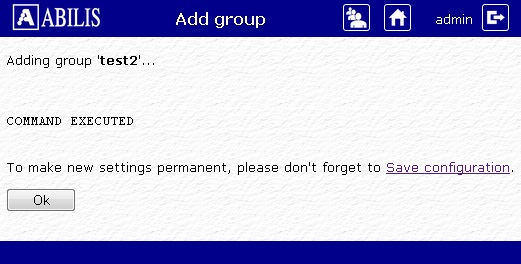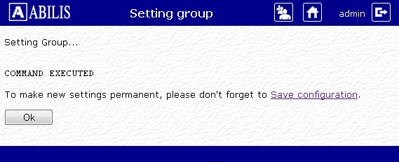 [14:08:39] ABILIS_CPX:a http rights path:/sys/admin/groups/ user:httpuserCOMMAND EXECUTED [14:16:06] ABILIS_CPX:d http rights- Not Saved (SAVE CONF) ------------------------------------------------------- ------------------------------------------------------------------------------- ID: PATH: USER: FILE: DIR: RECUR: PROT: ------------------------------------------------------------------------------- 1 /sys/ admin r--- l--- YES PLAIN,SSL ... ------------------------------------------------------------------------------- 10 /sys/admin/groups/ httpuser r--- l--- YES PLAIN,SSL ------------------------------------------------------------------------------- 2 /sys/pub/ anonymous r--- ---- YES PLAIN,SSL ------------------------------------------------------------------------------- ...