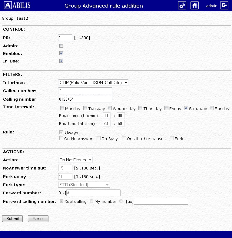 Enable DND for calls incoming on CTIP interface, calling every number starting with 012345, only on Saturday. Then, click the Submit button on the bottom of page.