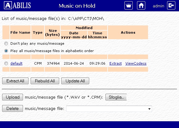 This section allows to modify the music on hold for the telephone calls.