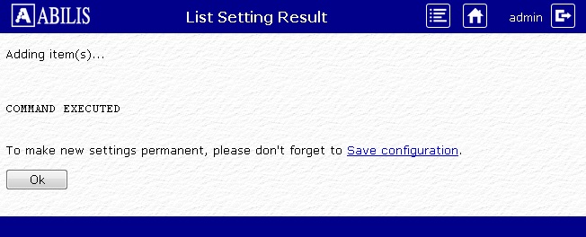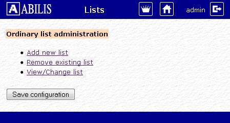 On the next page the user can create, remove or modify a list (this operations are similar to typing d/a/c/s list command on the control port); save the configuration pressing the Save configuration button.