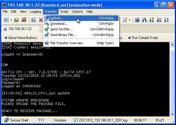 Enter into the Abilis control-program with a Terminal Emulator with file transfer support (e.g. Windows HyperTerminal, Zoc, ecc...).