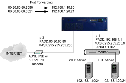 a nat pr:2 inat:out onat:in add:dst net:80.80.80.80/32 anet:192.168.1.20/32 pat:yes prot:tcp dpo:8021 apo:21Add a NAT entry for the access to the FTP server.