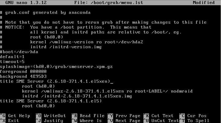 Modify the /boot/grub/menu.lst file by changing the lines under title SME Server (2.6.18-341.4.1.el5xen) into: