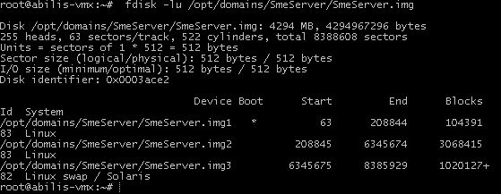 Find the start of the partition to mount: fdisk -lu /opt/domains/SmeServer/SmeServer.img
