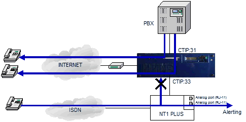 Consider the following scheme: when all VoIP channels are busy, a new incoming call is refused by the CTIP:33 and the NT device forwards the call to the analog ports; in this way the call doesn't reach the BUSY state but the ALERTING state.