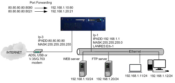 Suppose to enable the accesses from the Internet to WEB and FTP servers. See the previous section: Section 75.16, “How to access IP hosts and services which are behind a NAT manager (port forwarding)”.